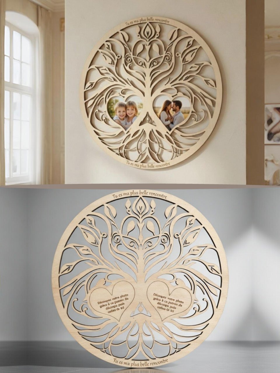Célébrez l’union et la complicité avec cet Arbre de l’Amour Vital, une pièce d’exception conçue pour sublimer vos plus beaux moments. Au cœur d’un feuillage entrelacé d’une grande finesse, deux cadres en forme de cœur accueillent vos photographies, faisant de cette œuvre un pont entre art décoratif et album souvenir.
