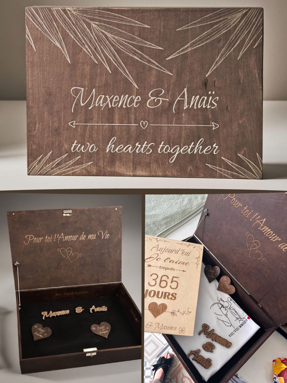 Accessoires Assortis : La boîte contient des éléments coordonnés comme des cœurs gravés et les deux prénoms.