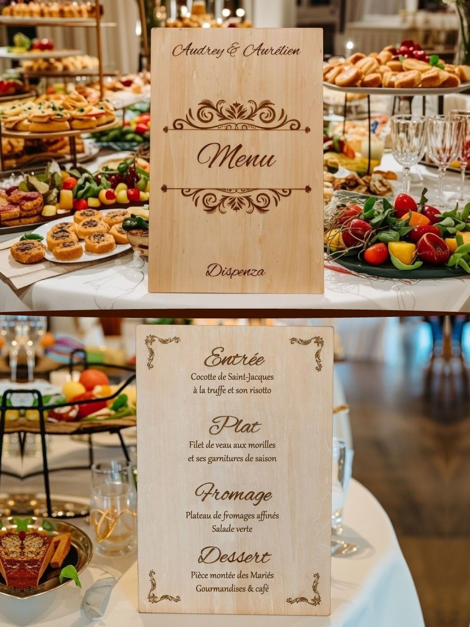 Sublimez votre réception de mariage avec "Le Menu de l’Amour". Ce menu gravé sur bois apporte une touche rustique et haut de gamme à votre décoration de table. Bien plus qu’une simple liste de mets, c’est un objet de collection que vos invités prendront plaisir à admirer.